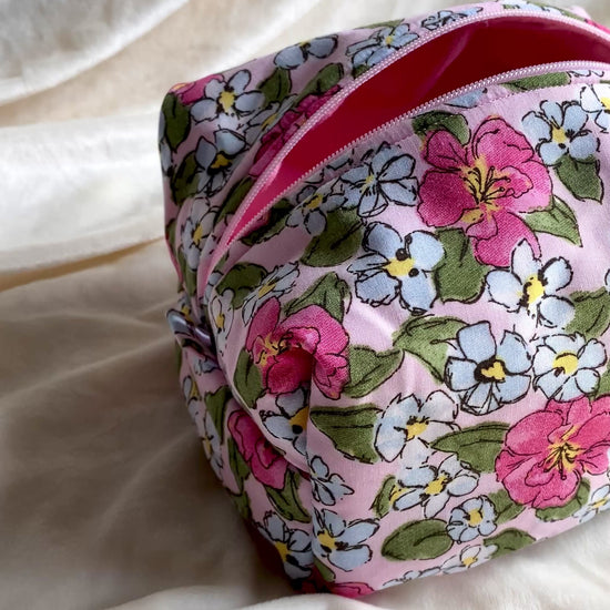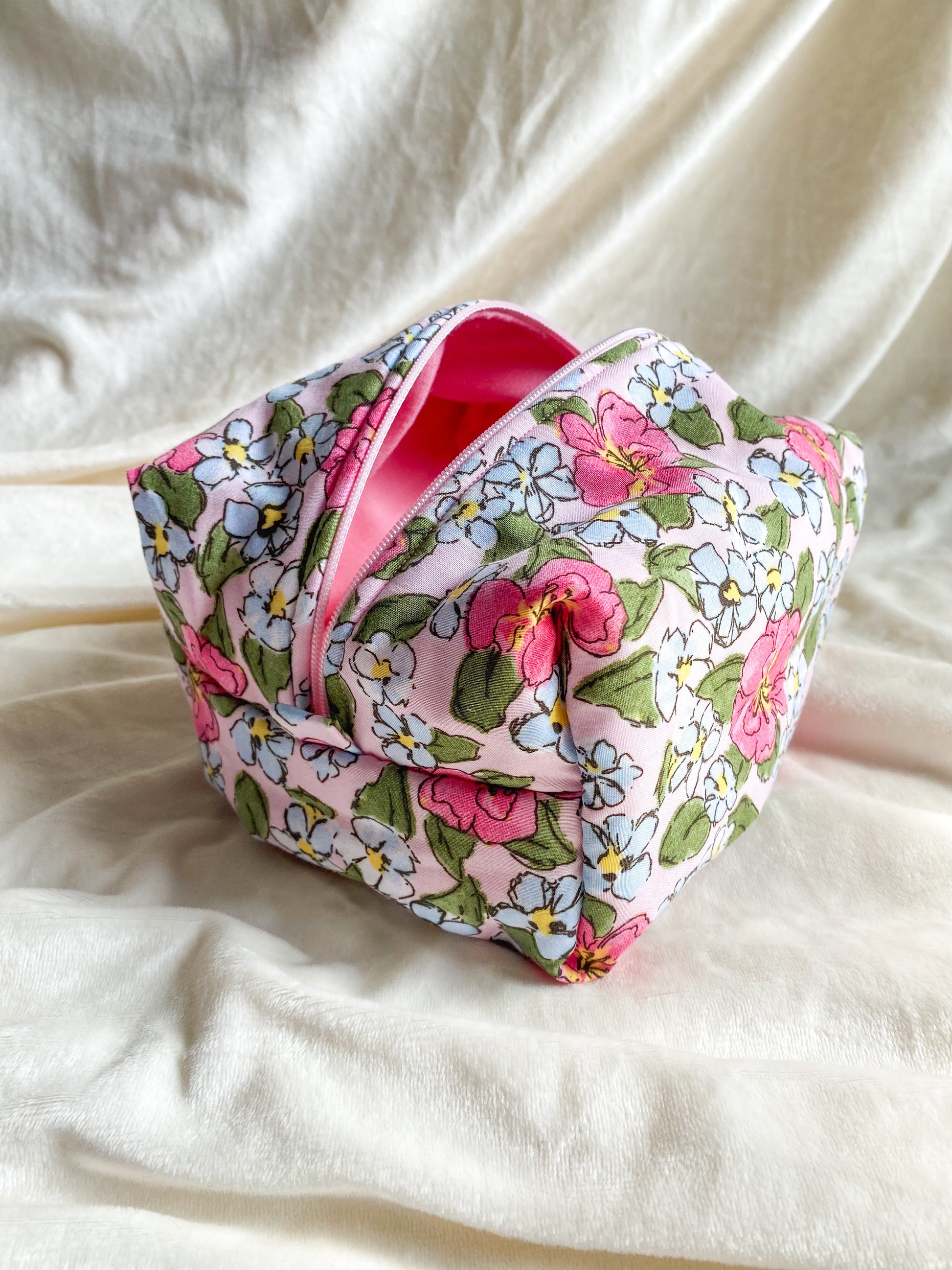 The Light Pink Floral Makeup Box Pouch is made from 100% cotton fabric, offering a soft and breathable feel. Its exterior features a charming floral design in vibrant colors, while the interior is lined with elegant pink cotton. This stylish and durable pouch is perfect for storing your makeup essentials.
